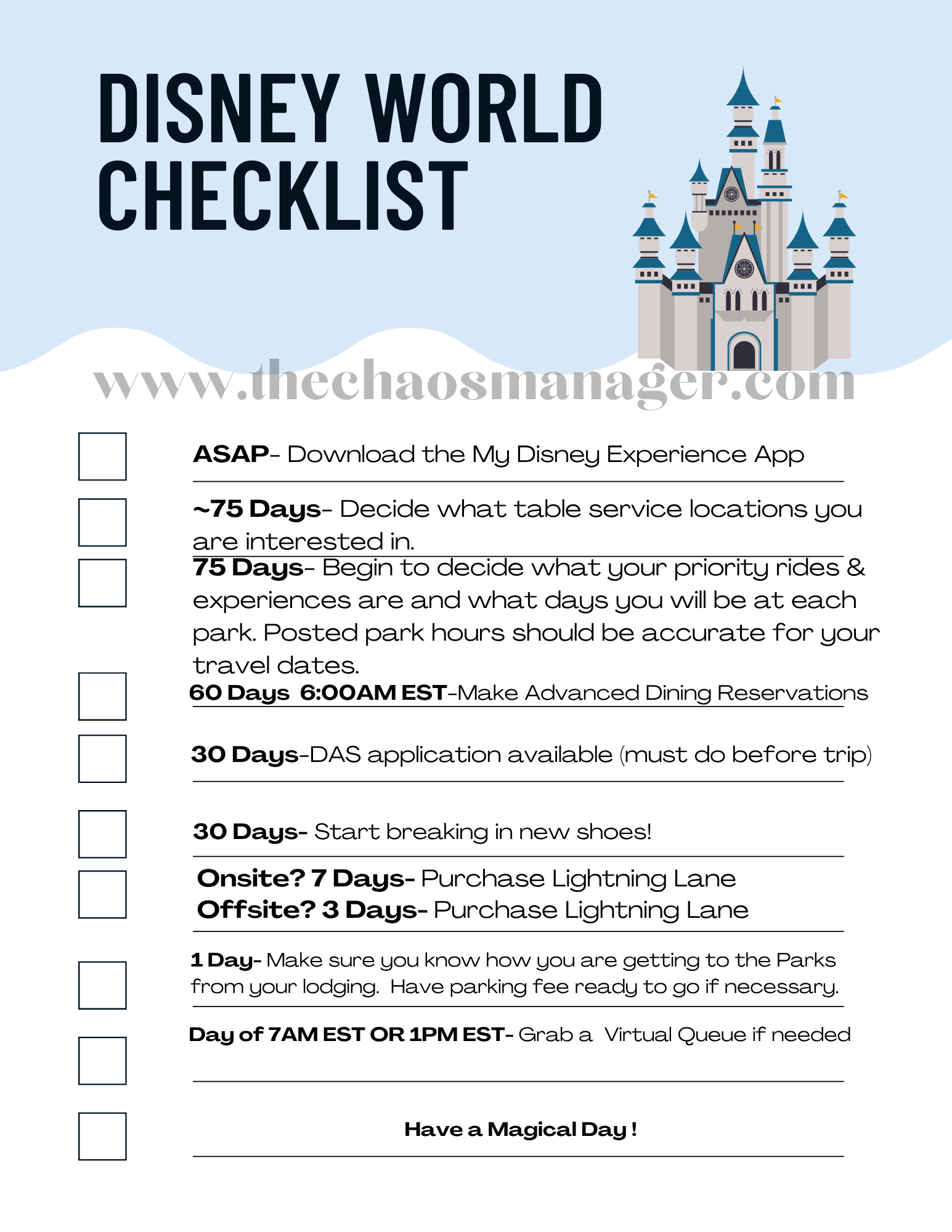 As far as the Disney World checklist and timeline, here is what you need to know: