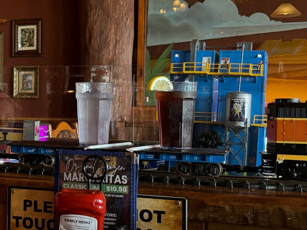 The restaurant as a whole has a western-ish theme, but the overarching theme is trains. Thomas the Train movies play on the large screen TVs that are situated throughout the restaurant. If you sit upstairs your drinks and some of your food will even be delivered by train!